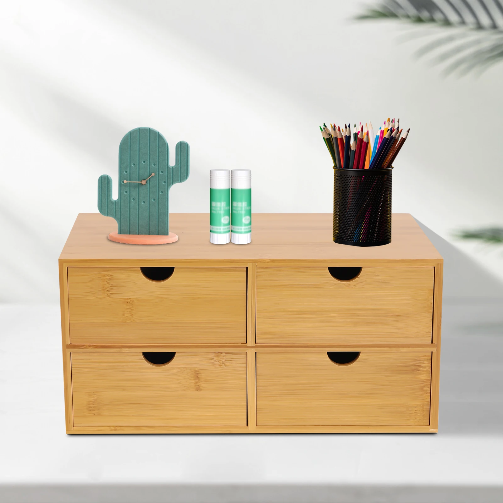 Keep your essentials neatly organized with this compact 4-drawer bamboo storage box — a natural and elegant solution for decluttering your desktop, vanity, or workspace.