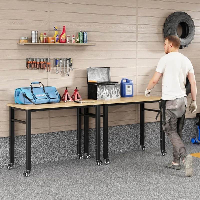 Maximize your workspace with this 48" adjustable portable workbench — featuring a durable rubber wood top, heavy-duty steel frame, and smooth-rolling wheels, perfect for garage, workshop, or industrial use.