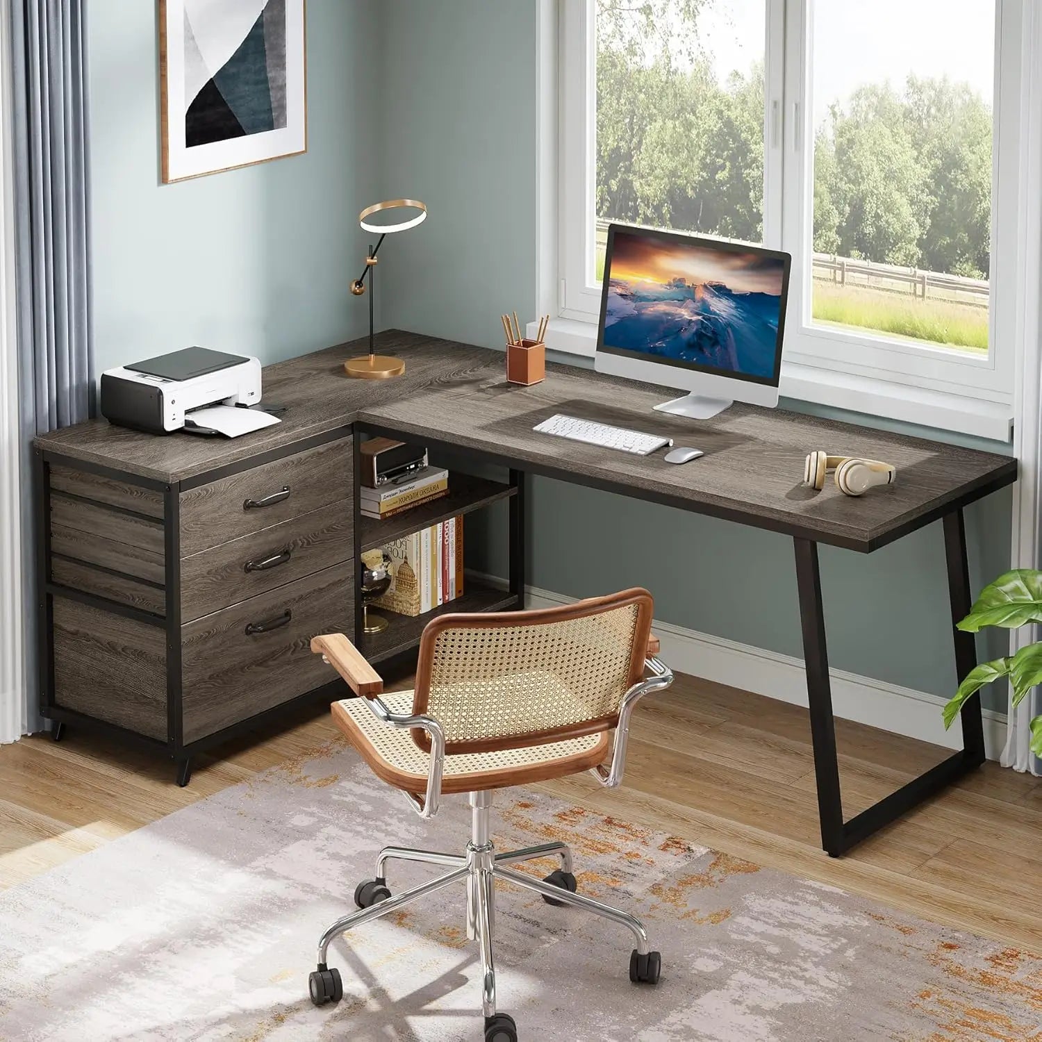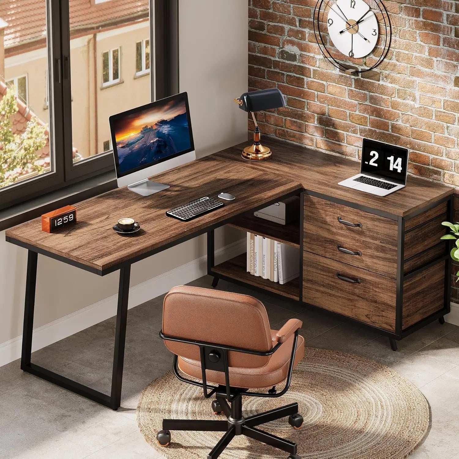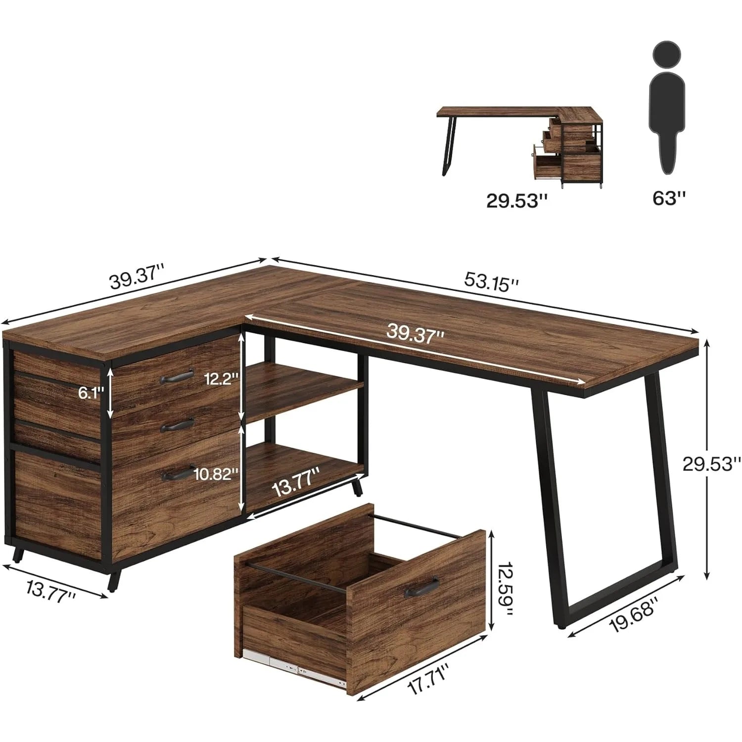 53" L-Shaped Office Desk – Reversible Computer Desk with 3 File Drawers & 2 Storage Shelves for Home Office, Study, or Gaming Room