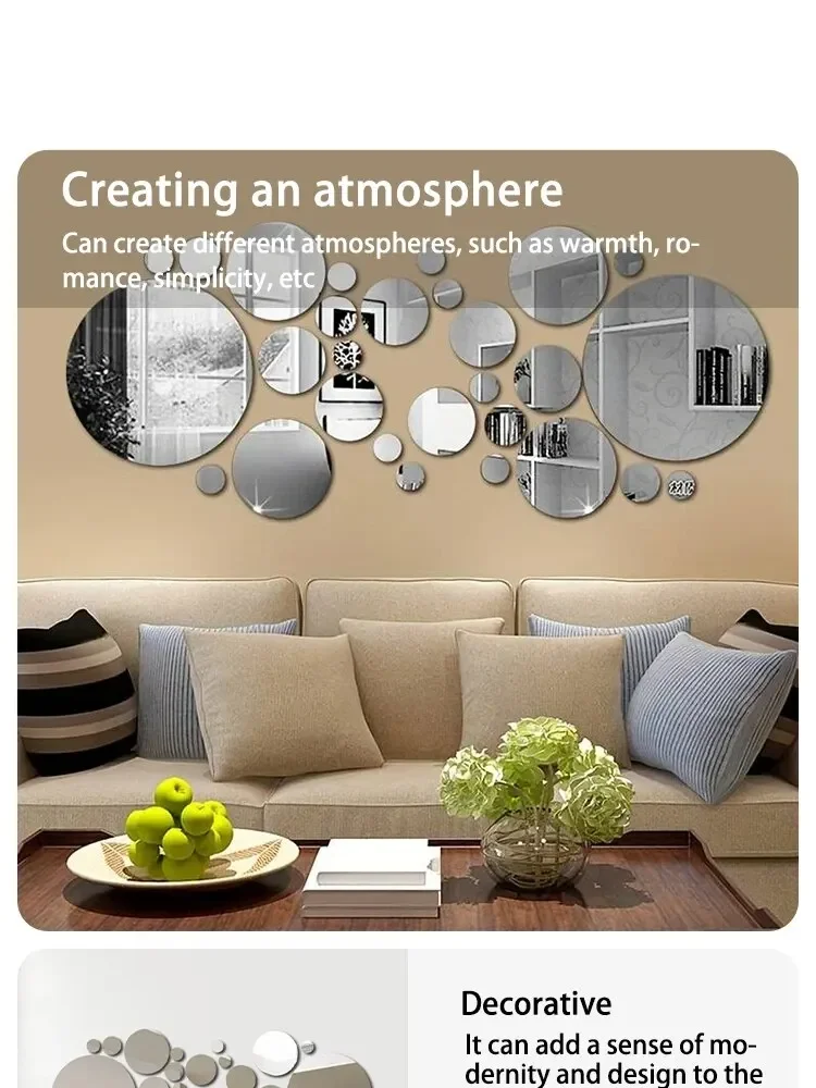 Enhance your living room or bedroom with this set of 26 round 3D Acrylic Mirror Wall Stickers. Easy to apply and remove, they add modern elegance and create an illusion of spaciousness, perfect for TV backgrounds or feature walls.
