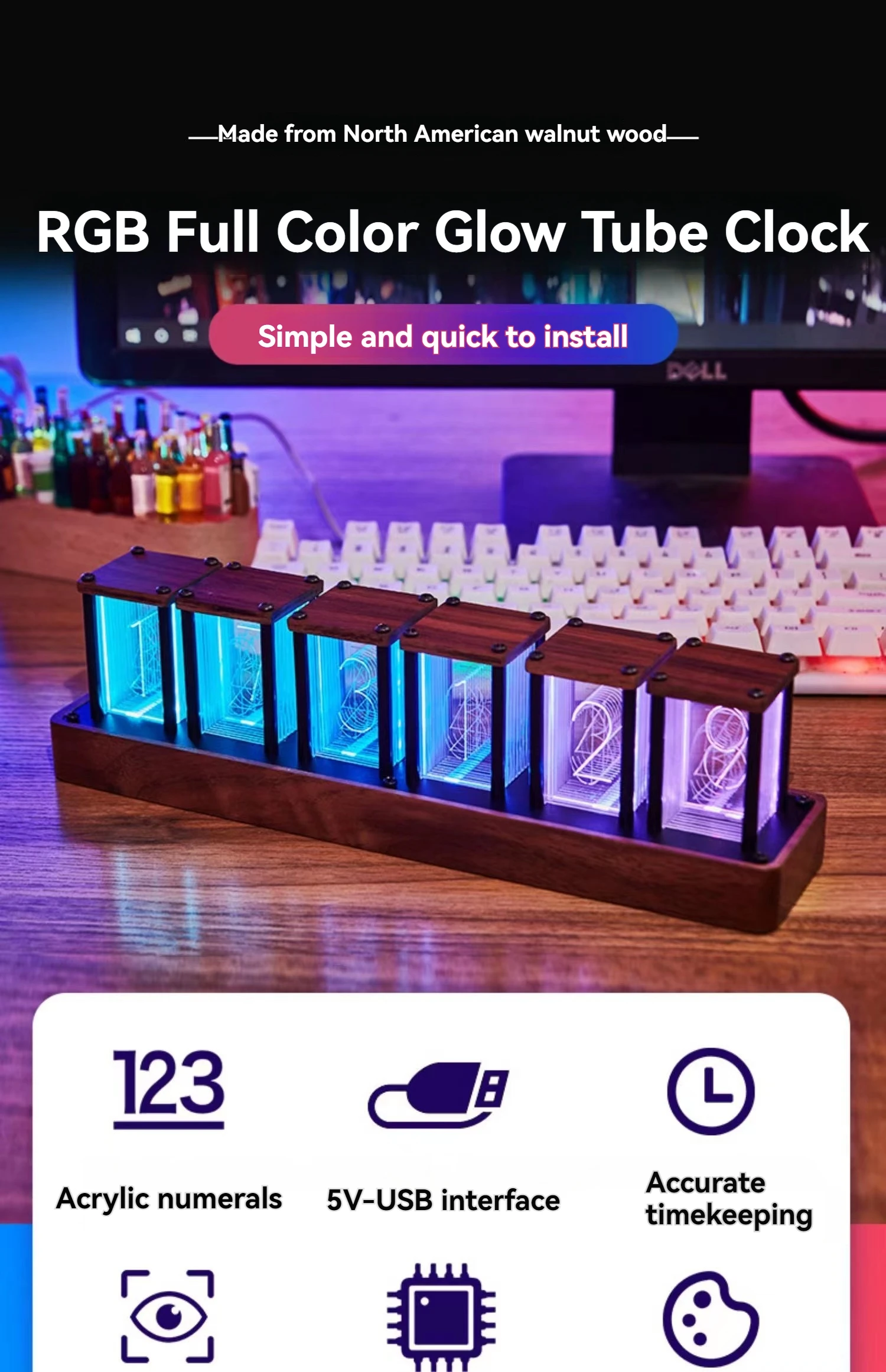 High-quality ABS housing with simulated glass nixie-style tubes and bright RGB LED digital display, powered via USB.
