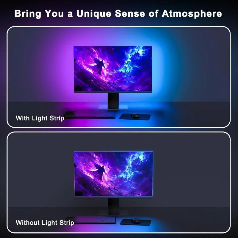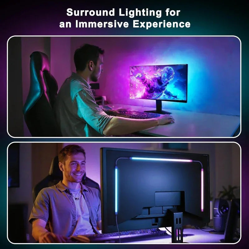 Transform your gaming or work setup with this Smart Ambient PC Monitor Backlight — a USB-powered RGB LED strip that syncs with your display and adds dynamic, customizable lighting for an immersive experience.
